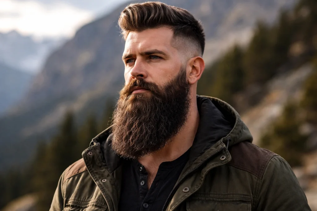 Pairing a faded beard with an undercut hairstyle creates one of the most striking combinations in contemporary men’s grooming. The undercut provides a bold contrast between the longer hair on top and the shaved sides, and when matched with a faded beard, the two elements work together to frame the face with tremendous visual impact.